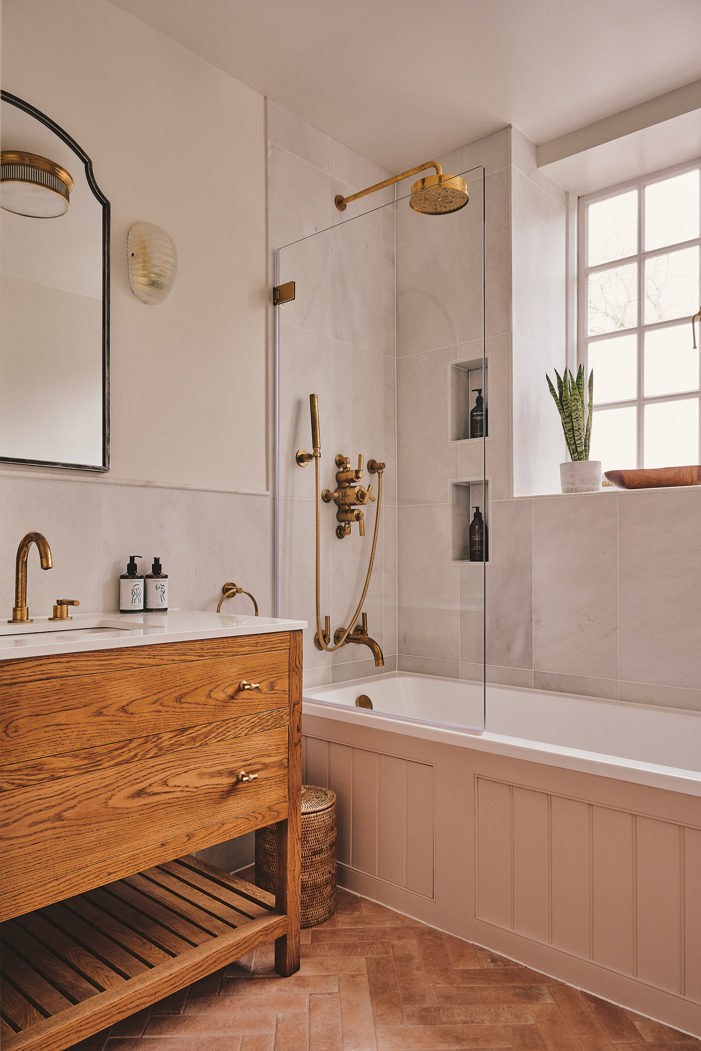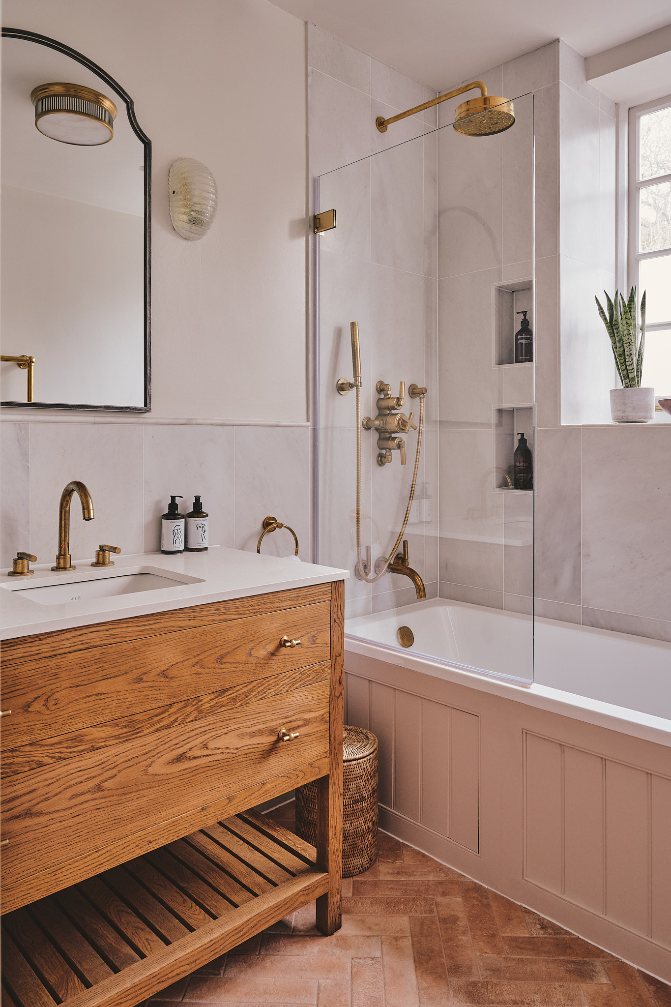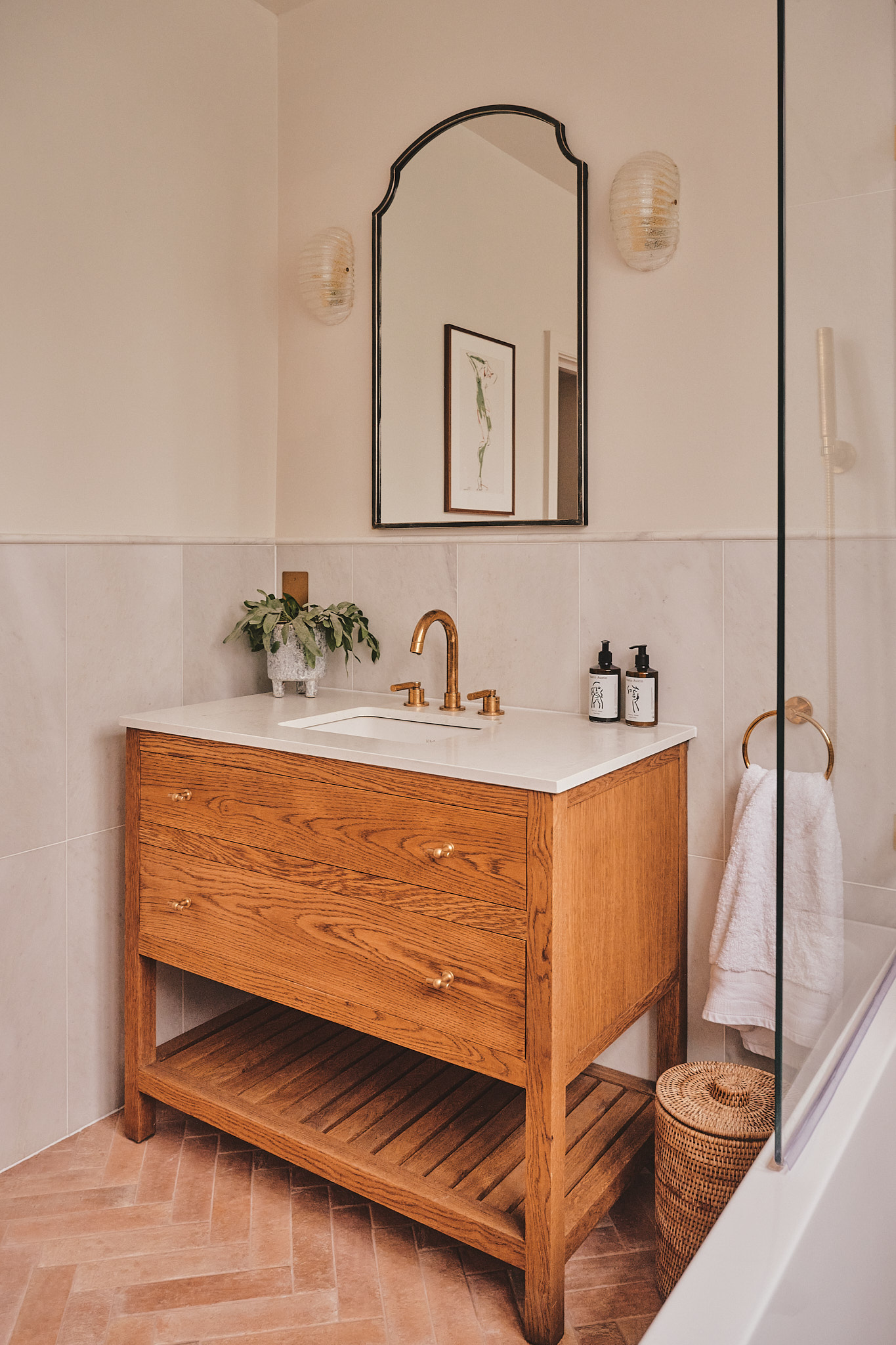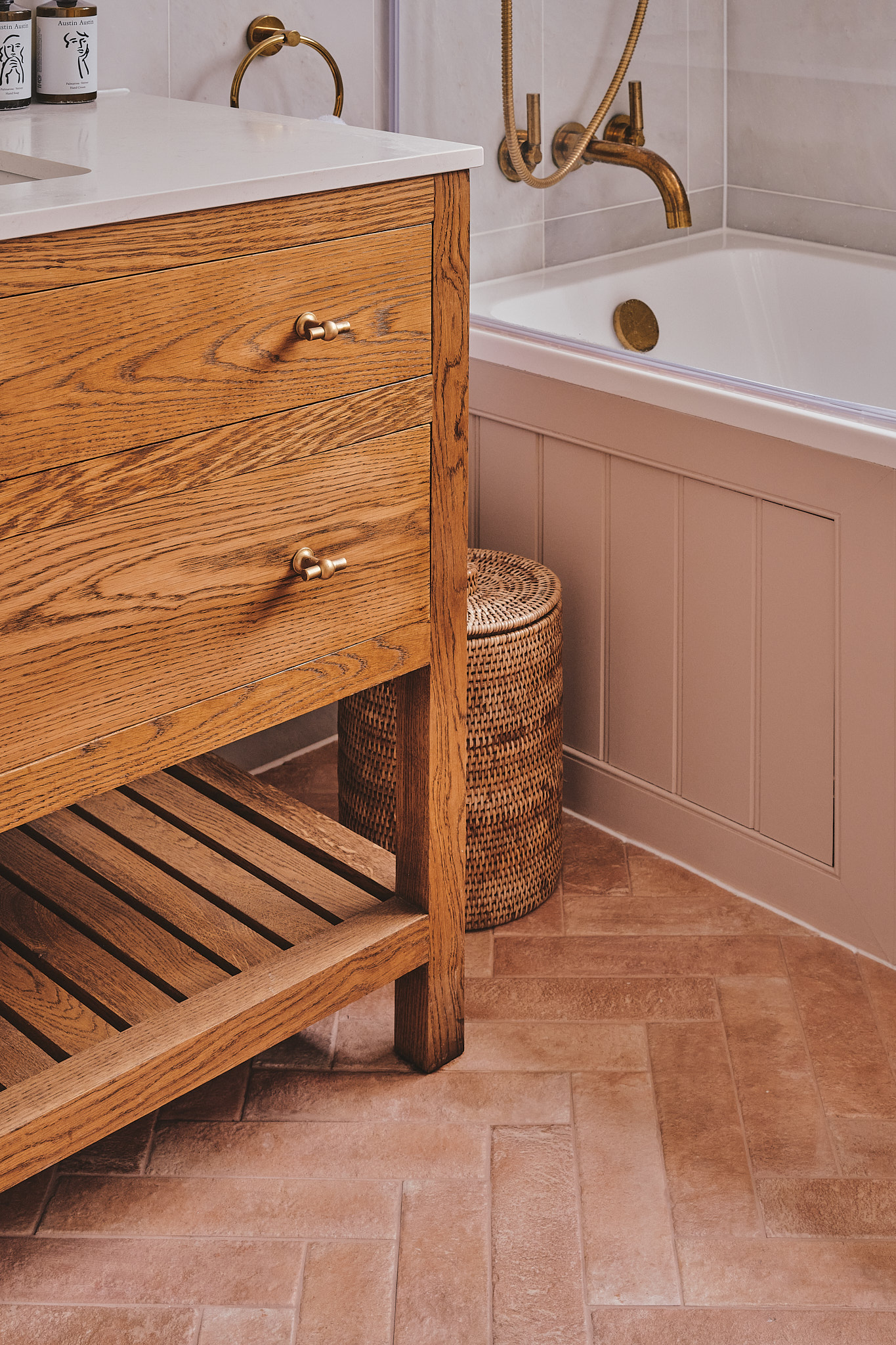 This bathroom was designed to feel warm, timeless and quietly luxurious, blending natural materials with classic detailing. Terracotta herringbone floor tiles add warmth and texture, while unlacquered brass fittings and a timber vanity introduce a soft, vintage character that complements the calm, neutral palette. The result is a serene, spa-like space that balances traditional charm with a modern, refined finish.
