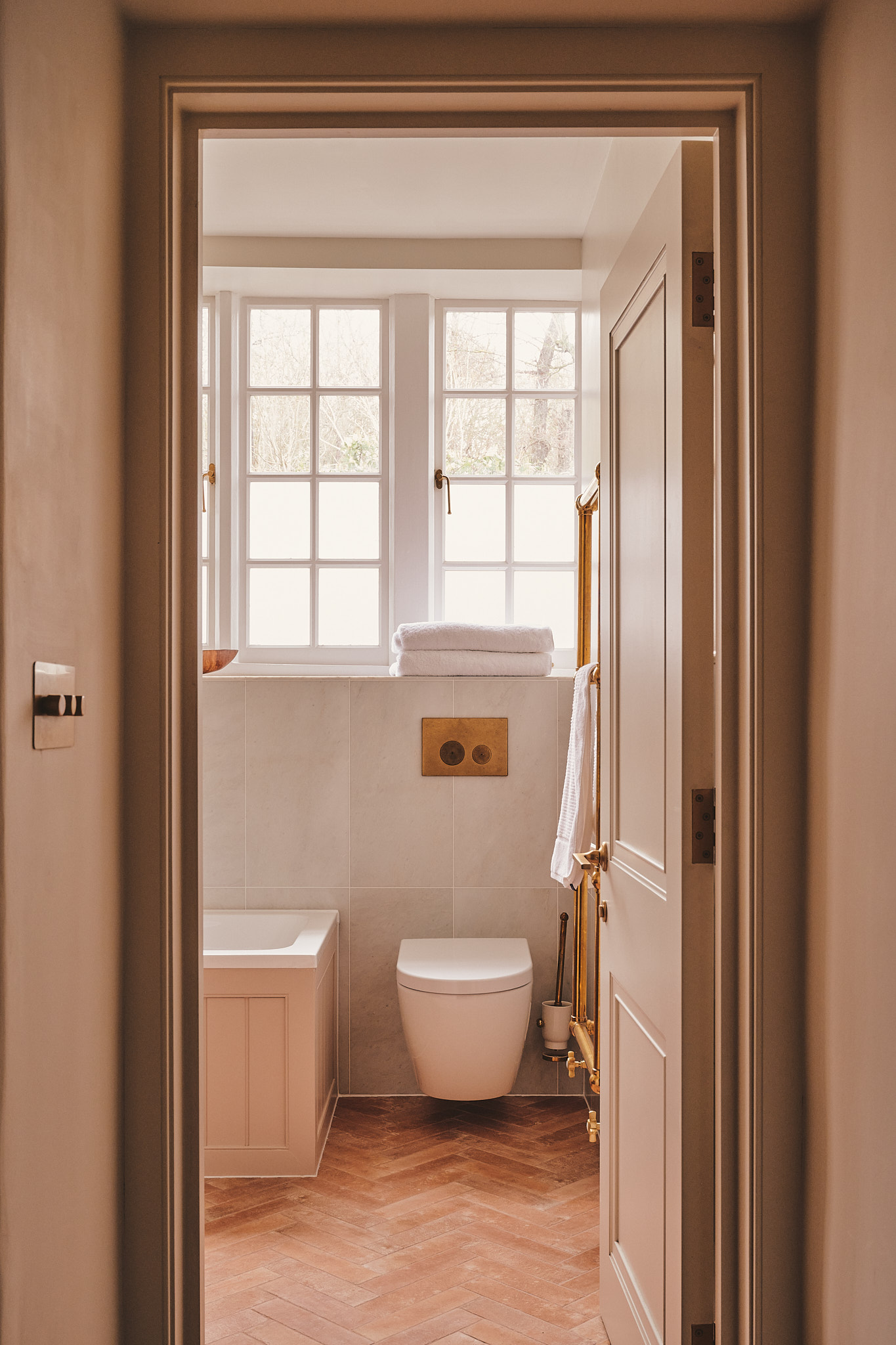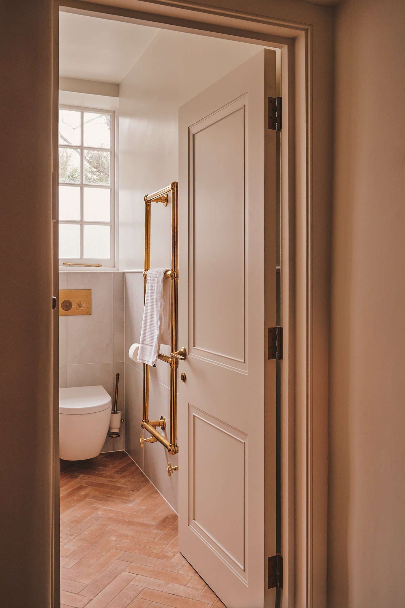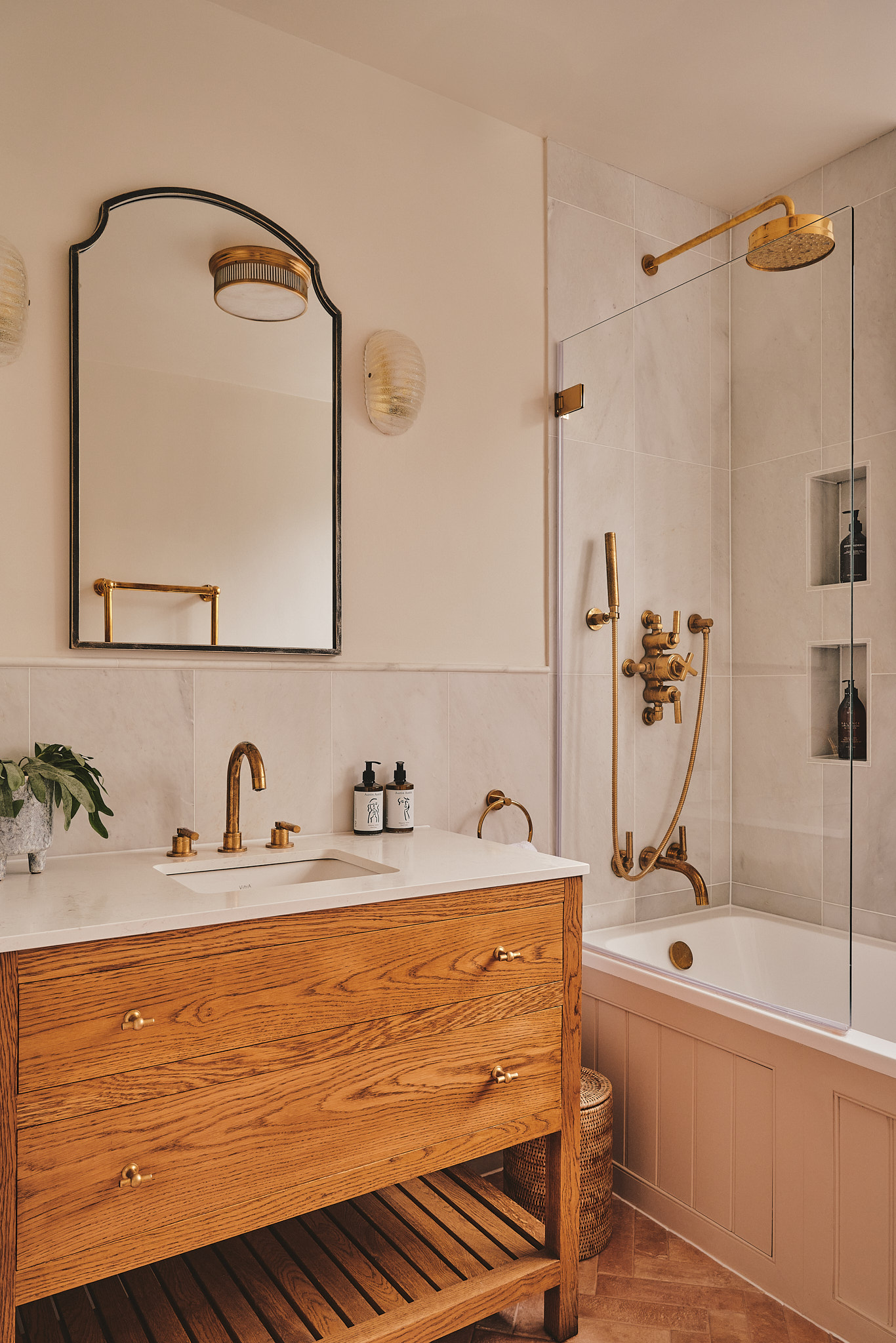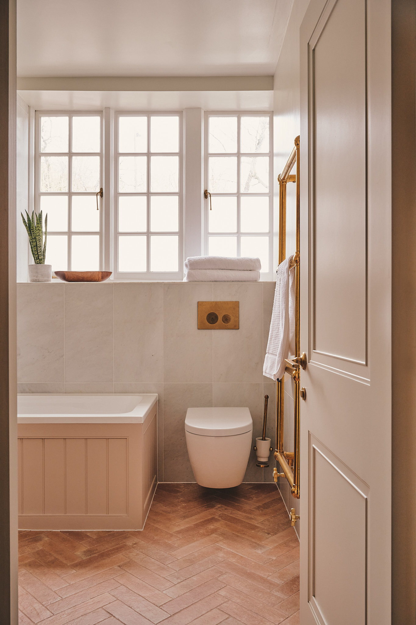 This bathroom was designed to feel warm, timeless and quietly luxurious, blending natural materials with classic detailing. Terracotta herringbone floor tiles add warmth and texture, while unlacquered brass fittings and a timber vanity introduce a soft, vintage character that complements the calm, neutral palette. The result is a serene, spa-like space that balances traditional charm with a modern, refined finish.