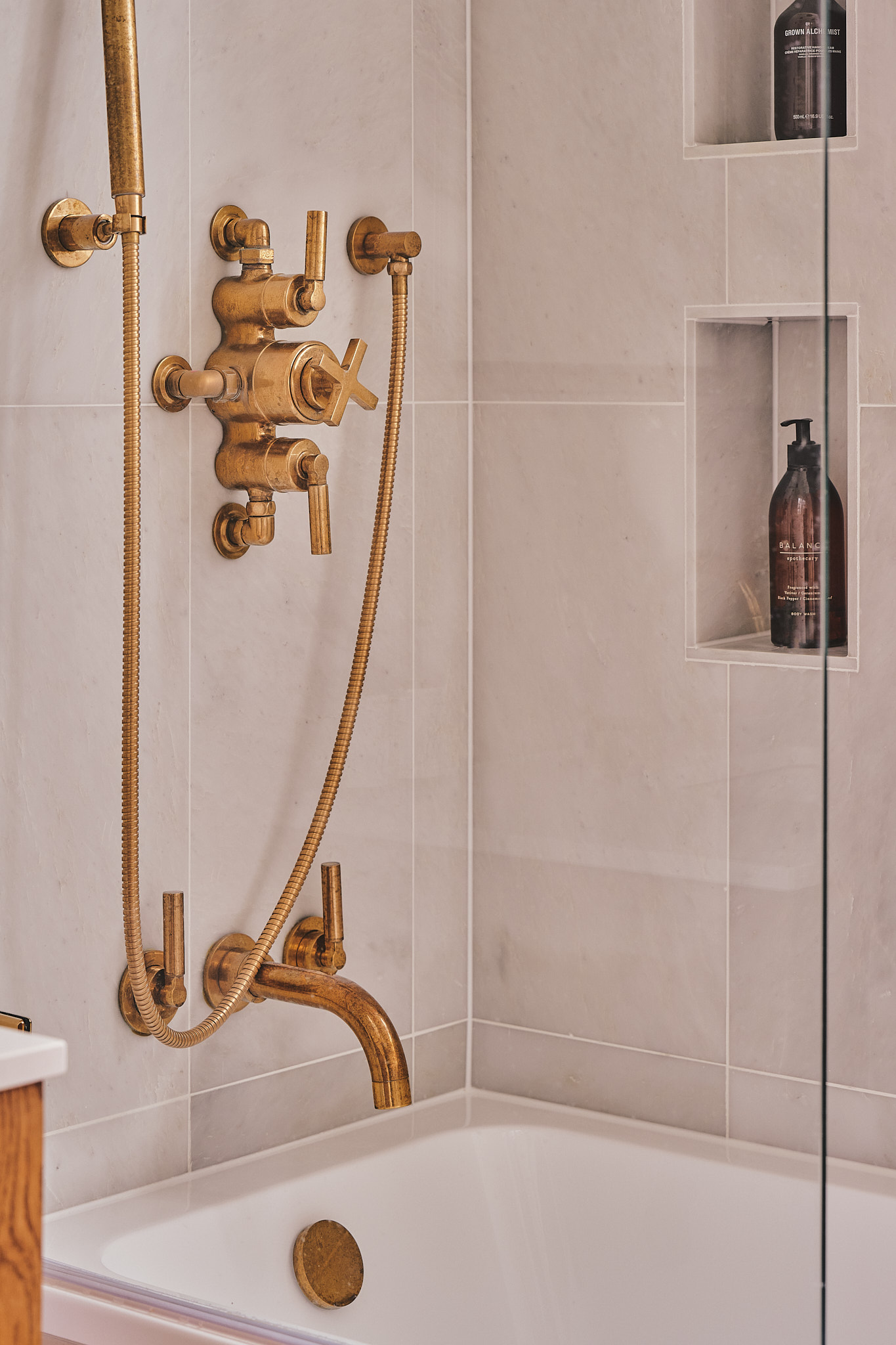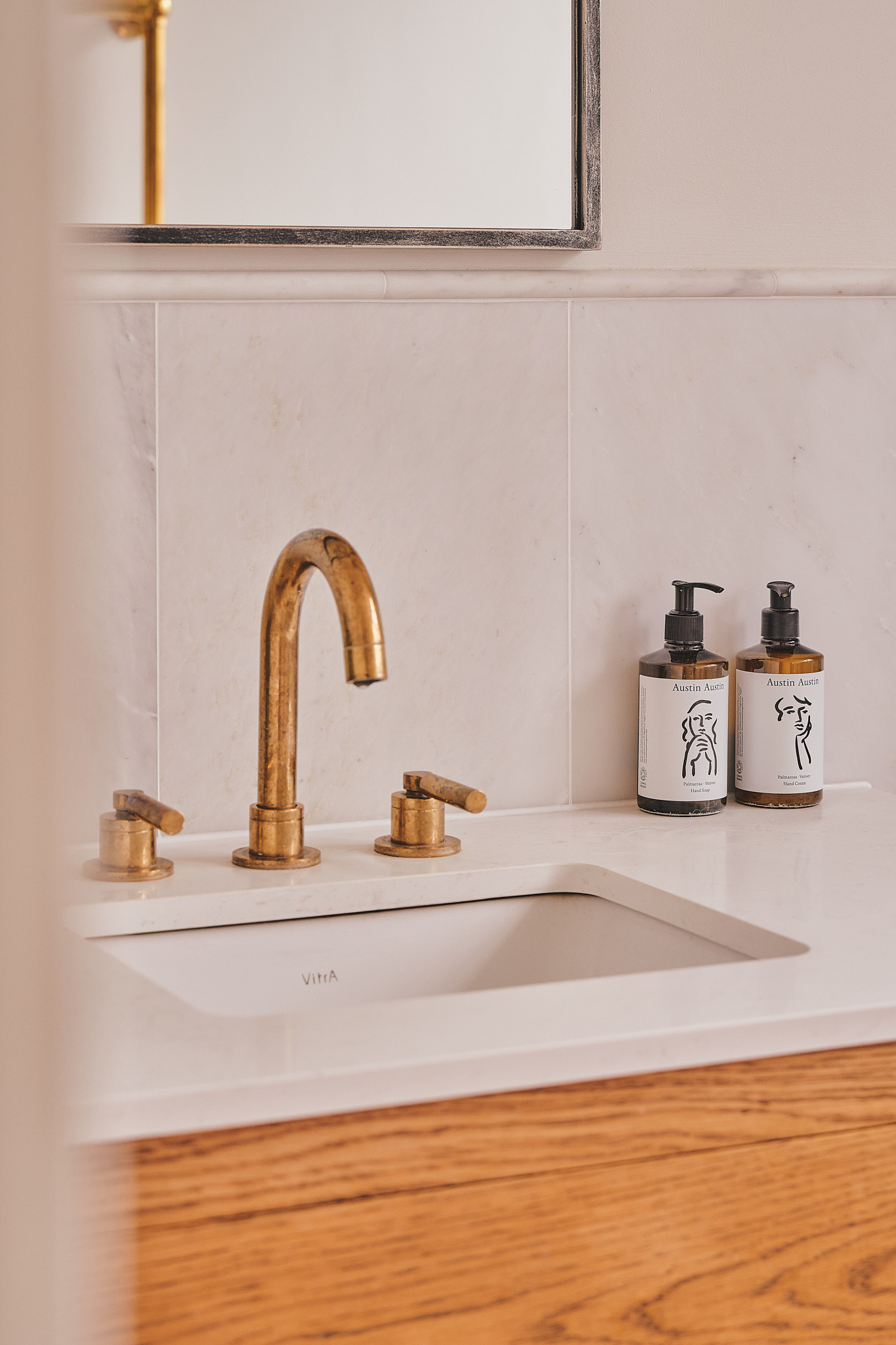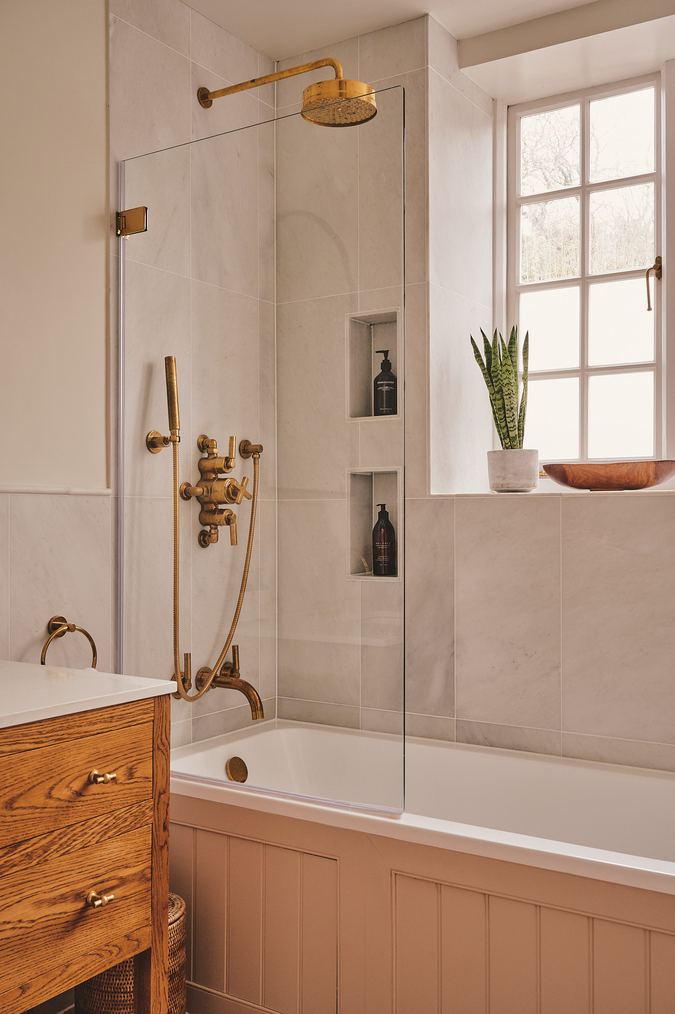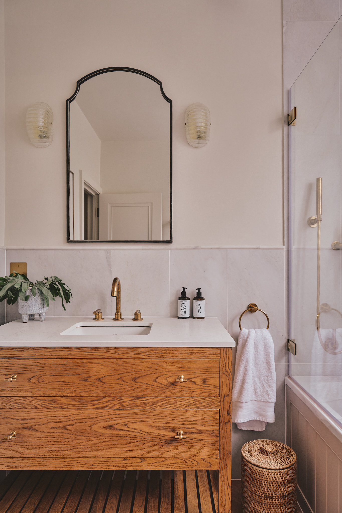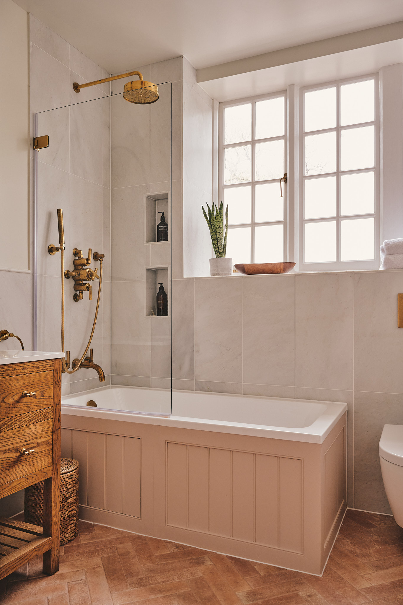 This bathroom was designed to feel warm, timeless and quietly luxurious, blending natural materials with classic detailing. Terracotta herringbone floor tiles add warmth and texture, while unlacquered brass fittings and a timber vanity introduce a soft, vintage character that complements the calm, neutral palette. The result is a serene, spa-like space that balances traditional charm with a modern, refined finish.