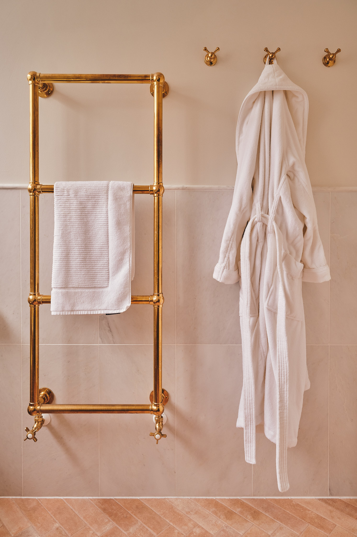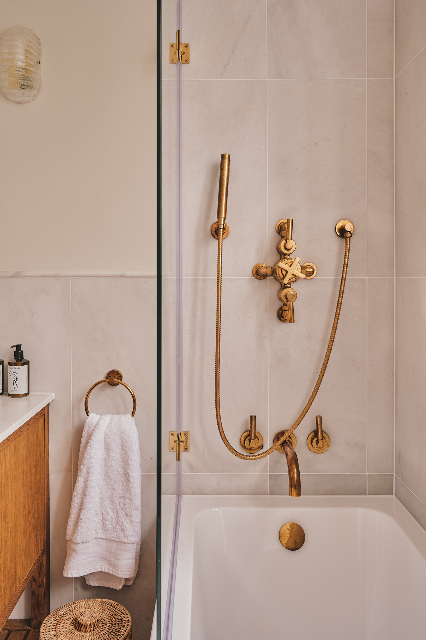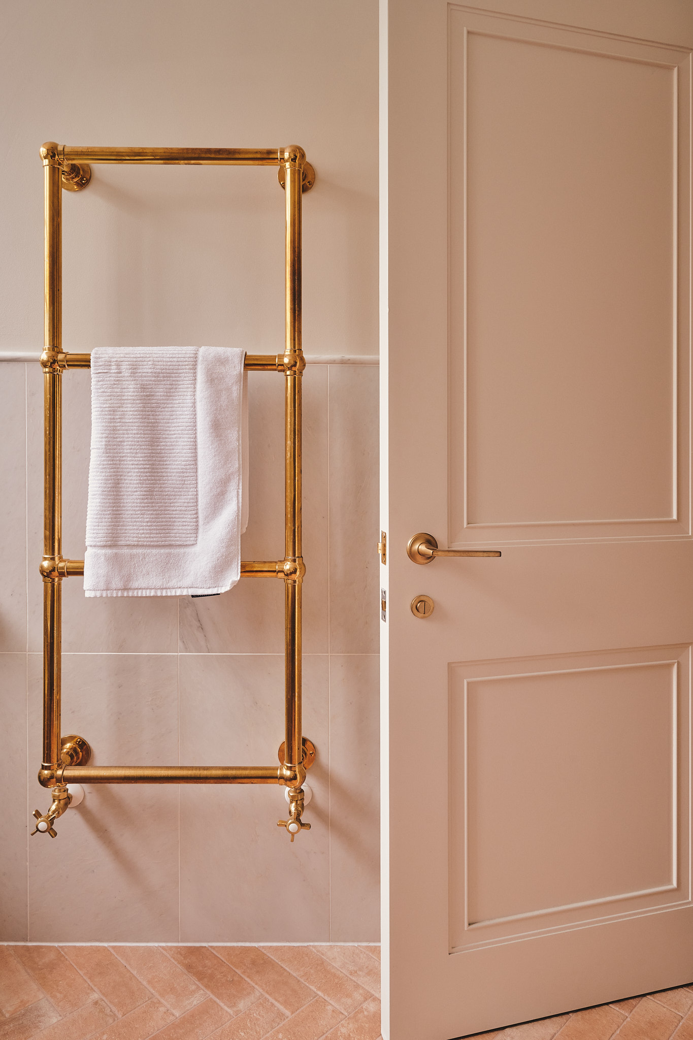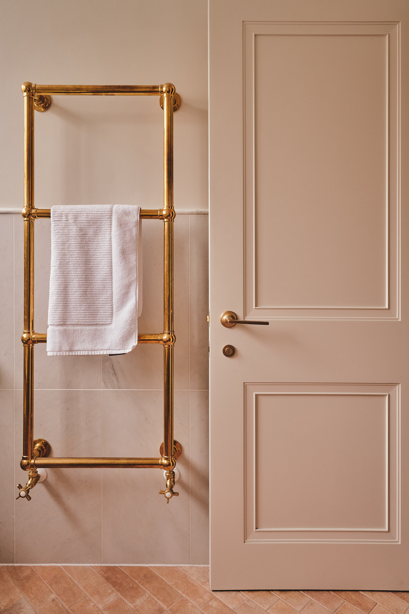 This bathroom was designed to feel warm, timeless and quietly luxurious, blending natural materials with classic detailing. Terracotta herringbone floor tiles add warmth and texture, while unlacquered brass fittings and a timber vanity introduce a soft, vintage character that complements the calm, neutral palette. The result is a serene, spa-like space that balances traditional charm with a modern, refined finish.